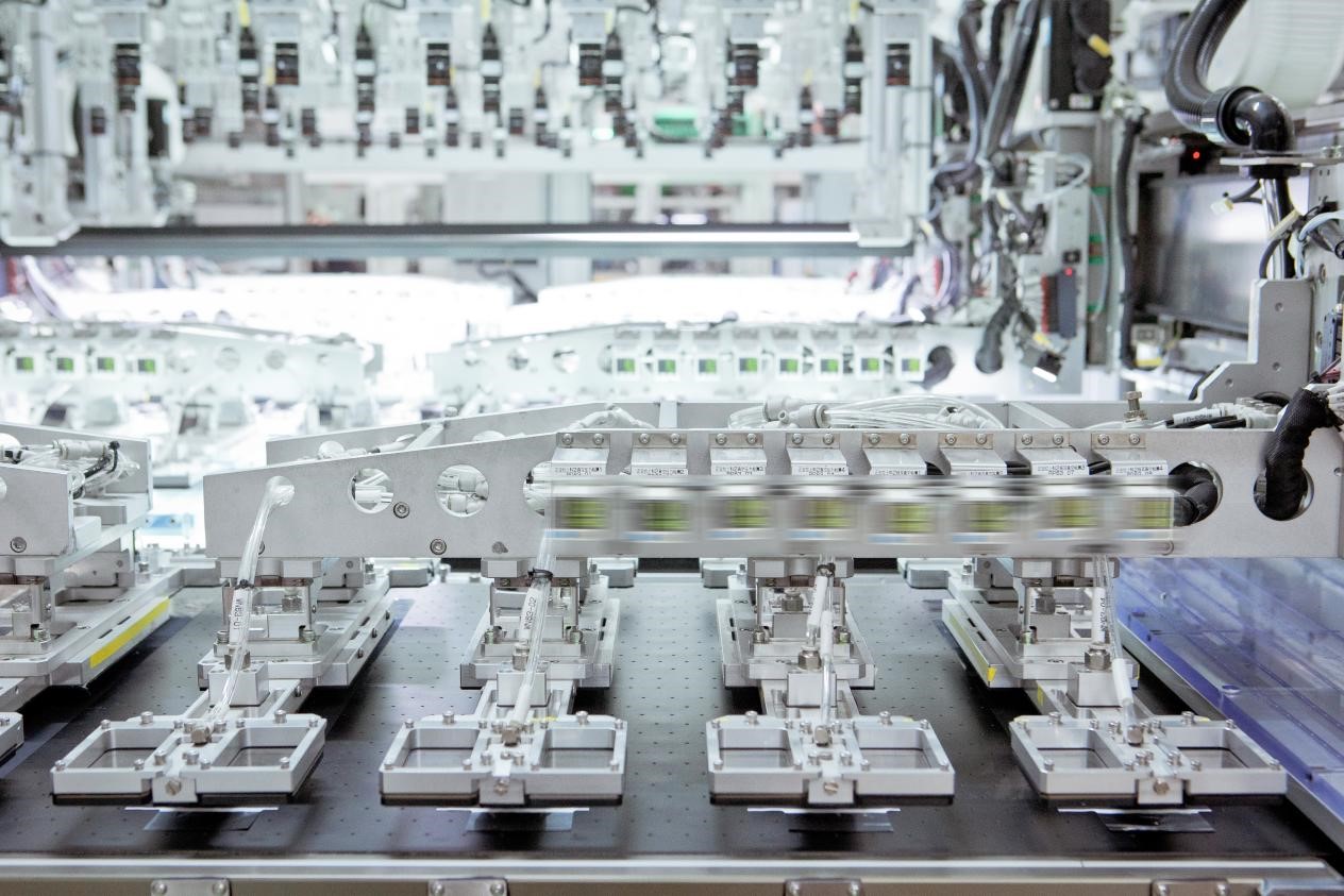 (圖示)這是最核心的,我們的飛疊,因?yàn)樵诏B片和卷繞對(duì)比中,疊片這個(gè)工序里的生產(chǎn)效率是最大的瓶頸,這是比較低的。我們現(xiàn)在是0.125秒,是第三代,第四代是0.08,現(xiàn)在正在加緊進(jìn)行量產(chǎn)前的準(zhǔn)備工作。