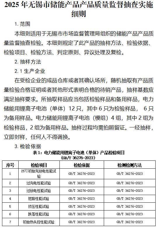 中國儲能網(wǎng)訊:4月21日,江蘇無錫市市場監(jiān)督管理局發(fā)布《2025年無錫市儲能產(chǎn)品產(chǎn)品質(zhì)量監(jiān)督抽查實施細(xì)則》。