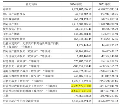 2024年,公司經(jīng)營性應(yīng)付項(xiàng)目減少了18.39億元(現(xiàn)金流表中為-18.39億元,負(fù)值表示應(yīng)付款減少,實(shí)際支付現(xiàn)金增加),而2023年該項(xiàng)為增加8.47億元,對現(xiàn)金流形成正向貢獻(xiàn)。相比之下,2024年該項(xiàng)導(dǎo)致公司多流出現(xiàn)金約26.86億元,顯著加大了經(jīng)營活動(dòng)現(xiàn)金流的壓力。造成這一變化的可能原因包括:公司縮短了對供應(yīng)商的付款周期;報(bào)告期內(nèi)支付票據(jù)到期款;或是公司主動(dòng)優(yōu)化與供應(yīng)商的合作關(guān)系,以換取更有利的采購條件,雖然短期現(xiàn)金流承壓,但可能有利于長期成本控制和供應(yīng)穩(wěn)定性。
