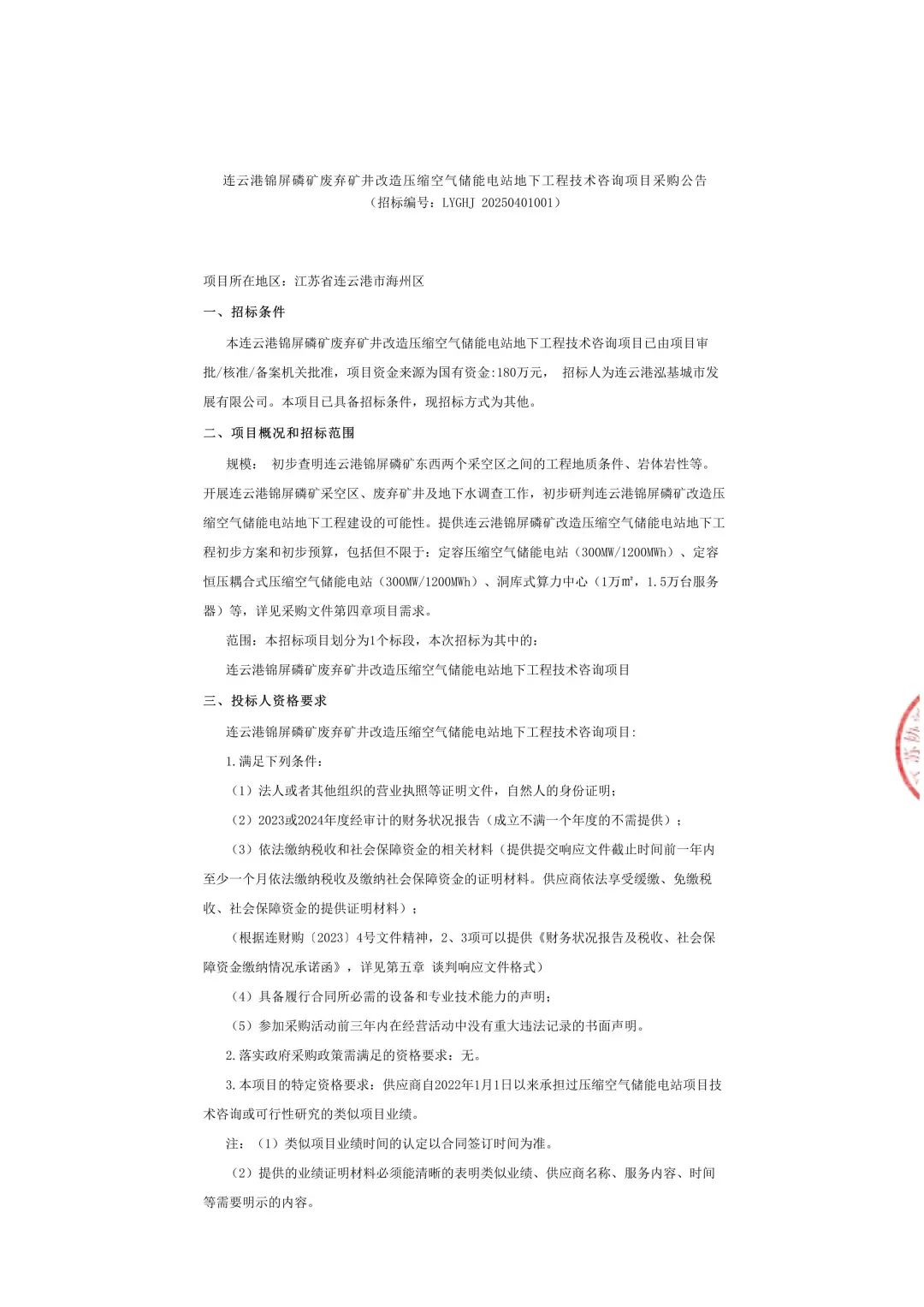 中國儲能網(wǎng)訊:4月21日,連云港錦屏磷礦廢棄礦井改造壓縮空氣儲能電站地下工程技術(shù)咨詢項目采購公告發(fā)布。