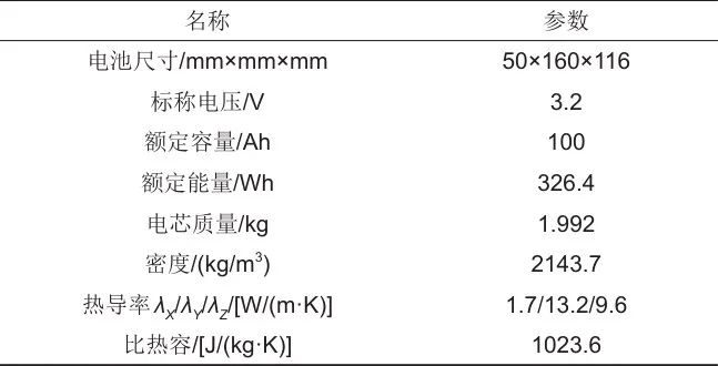 為了建立電池?zé)崮P?,需要獲取電池單體的熱物性參數(shù)。以方形磷酸鐵鋰(LFP)電池為對象,文中鋰電池的熱物性參數(shù)通過實驗獲得,根據(jù)文獻(xiàn)[17]的方法得到單體鋰電池各部分的相關(guān)參數(shù),電池基本參數(shù)如表1所示。