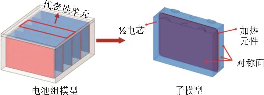 根據(jù)方形電池的對稱性,選擇電池的1/2對稱體積建立模型即可滿足仿真需要。簡化的電池組模型由2個半電池組成,電池大面相對放置,電池側(cè)面與剖面均設(shè)置為對稱表面。在低溫環(huán)境溫度下,本工作采用加熱膜在短時間內(nèi)將電池模組加熱至適宜的工作溫度,并確保電池組良好的溫度均勻性,便于后續(xù)的正常充放電行為。加熱膜的基本參數(shù)見表2。根據(jù)加熱膜排布位置,分別在電池大面、側(cè)面和底面上粘貼加熱膜,電池模型見圖1。利用穩(wěn)壓電源向加熱膜輸入電信號,加熱膜產(chǎn)生熱量通過熱傳導(dǎo)由電池外表面?zhèn)鬟f至低溫電芯,為電池模組迅速升溫。