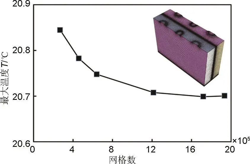 加密網(wǎng)格可以提高仿真計算的準(zhǔn)確性。網(wǎng)格尺寸過大會使計算失真,甚至導(dǎo)致結(jié)果發(fā)散;網(wǎng)格尺寸過小則會增加計算時間,浪費計算資源。本研究針對電池模型劃分不同網(wǎng)格尺寸,分析了不同數(shù)量的網(wǎng)格對模型計算精度的影響。如圖2所示,當(dāng)網(wǎng)格數(shù)超過120萬時,電池最大溫度趨于平穩(wěn),因此確定網(wǎng)格模型共計4514415個節(jié)點、1229694個網(wǎng)格單元。