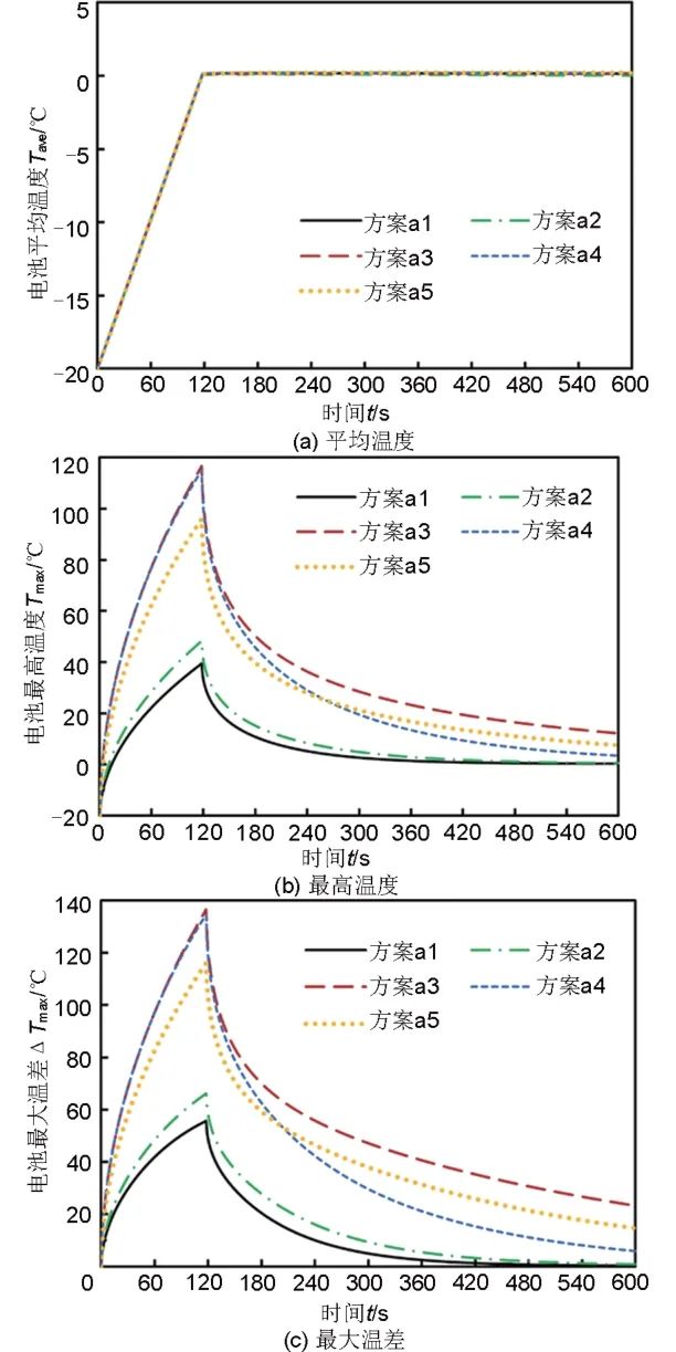 如圖6(a)所示,使用同一功率加熱電池,加熱膜布置方式不同,但電池平均溫度呈現(xiàn)相同的溫升趨勢,線性升溫至0 ℃,之后趨于穩(wěn)定。由圖6(b)、(c)可知,后3種方案最大溫度高于90 ℃,超過電池的正常工作溫度范圍,極大地影響了電池壽命。在相同的加熱功率下,后3種方案的加熱膜功率密度相比前2種方案增大數(shù)倍,短時間內(nèi)電池傳熱速率比加熱速率慢,使得電池局部溫度激增,溫差升高。僅通過大面加熱的方案a1,電池的最高溫度和最大溫差分別控制在39.4 ℃和55.7 ℃以內(nèi),電池的低溫加熱性能最優(yōu)。其次,通過雙側(cè)面加熱的方案a2加熱電池,其電池的最高溫度和最大溫差與大面加熱方案相比提高了18%。但雙側(cè)面加熱方案與大面所使用的加熱膜相比,表面材料成本減少了38%。