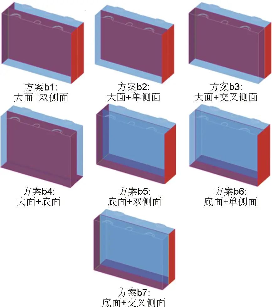 對第2.2節(jié)不同的加熱膜布置方式進(jìn)行組合,共采取了7種加熱膜組合加熱方案,具體方案詳情如圖7所示,分析加熱膜多維度協(xié)同加熱對電池溫升效果的影響。