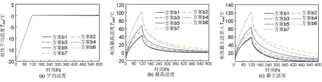 采用加熱膜多維度協(xié)同加熱方案時,加熱膜的功率相同,電池平均溫度變化一致,表明加熱膜的布置方式對電池總體傳熱情況的影響較小。圖8(b)(c)表明,方案b1、b3、b4的電池最高溫度和溫升曲線上升趨勢最平緩,最高溫度在42 ℃以內(nèi),該3組方案的加熱效果最佳。其中方案b6與b7加熱效果最差,溫升曲線基本相同,電池最高溫度達(dá)到104 ℃左右。此外,對比圖8(c)電池最大溫差的變化,方案b4的溫差在加熱118 s停止后,電池經(jīng)過熱量傳遞,最大溫差仍在5 ℃以上,影響電池的使用性能。綜上,方案b1和方案b3的加熱效果更優(yōu)。