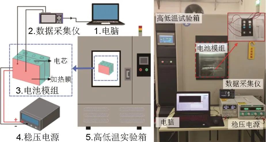 電池低溫加熱測試系統(tǒng)主要包含上位機、數(shù)據(jù)采集儀、電池模組、穩(wěn)壓電源和高低溫試驗箱等設(shè)備,系統(tǒng)示意圖見圖9。本實驗對象為100 Ah的鋰離子電池,開展電池低溫加熱實驗時,電池組四周及底部用氣凝膠氈與珍珠棉組成的保溫隔熱材料包裹,電池模組大面或側(cè)面上分別布置0.2 mm的加熱膜。