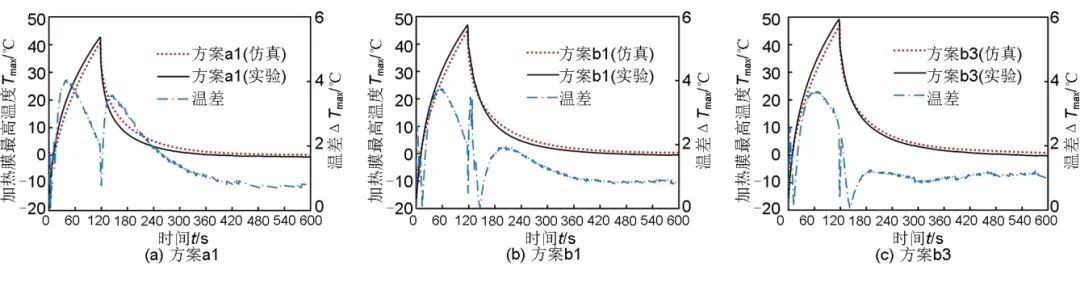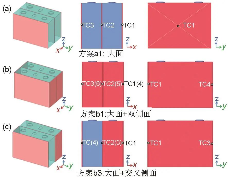 選用第2節(jié)中加熱效果良好的3種加熱膜布置方式(方案a1、方案b1和方案b3)開展實驗,對仿真結(jié)果進(jìn)行驗證。為保證-20 ℃的低溫實驗環(huán)境條件,將電池模組放入高低溫試驗箱中靜置24 h均溫,待電池內(nèi)外溫度保持穩(wěn)定時開展實驗。