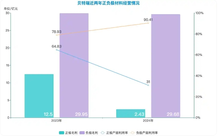 綜合來看,正極材料板塊是拖累貝特瑞業(yè)績的主因。綜合營收與毛利率之后,負(fù)極材料方面2023年與2024年的毛利基本持平,均為29億元。但正極材料2023年?duì)I收規(guī)模更大,利率也更高,全年的毛利為12.5億元,2024年降至2.43億元,差額達(dá)到了10億元。