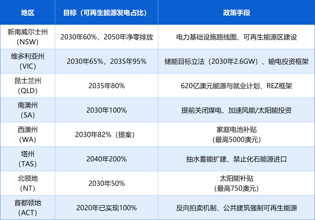 澳大利亞擁有豐富的太陽能資源,年輻照總量高達(dá)7621-8672MJ/m2,人均光伏發(fā)電量位居全球前列。聯(lián)邦“Powering Australia”計劃斥資200億澳元升級電網(wǎng);各州亦積極跟進,通過專項補貼加速清潔能源落地,如維多利亞州為電池儲能項目撥款1.19億澳元。政府政策持續(xù)加碼,計劃到2030年可再生能源發(fā)電占比達(dá)82%。