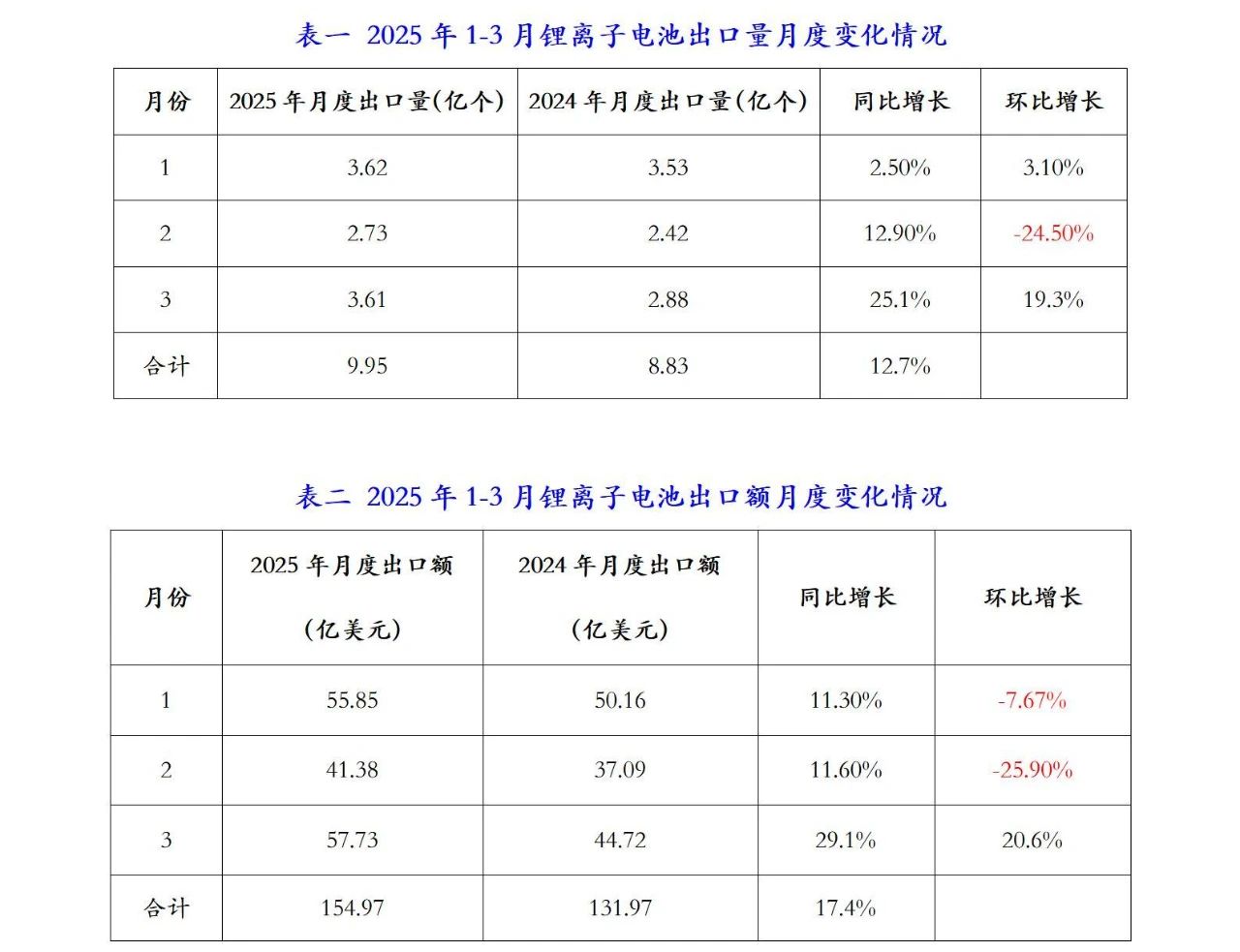 2025年1-3月鋰離子電池出口數(shù)量為9.95億個,同比增長12.7%;2025年1-3月我國鋰離子電池出口額為154.97億美元,同比增加17.4%,出口總體態(tài)勢良好。其中,2025年3月份,出口額逆轉(zhuǎn)1、2月份環(huán)比下降的趨勢,環(huán)比增長20.6%,達到57.73億美元,3月份,出口數(shù)量為3.61億個。