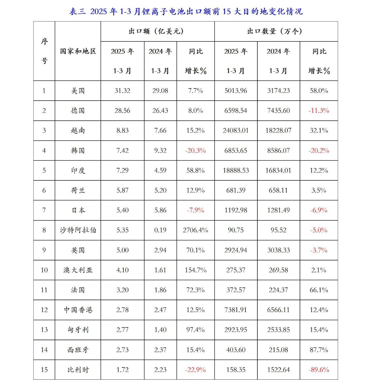 美國仍是我國鋰離子電池第一大出口市場,2025年1-3月出口美國金額為31.32億美元,同比增長7.7%,占我國鋰離子出口總額的20.2%。第二大市場仍為德國,出口金額為28.56億美元,同比增加8%,占我國鋰離子電池出口額的18.4%;越南為第三大出口市場,出口金額為8.83億美元,同比增長15.2%,占我國鋰離子電池出口額的5.7%。