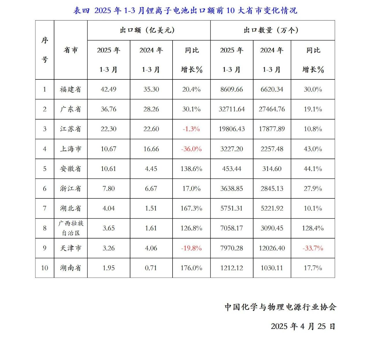 2025年1-3月福建省仍是我國鋰離子電池出口產(chǎn)品的最大來源地,出口金額為42.49億美元,同比增長20.4%,占我國鋰離子電池出口額的27.4%;出口數(shù)量為8609.66萬個,同比增長30%。廣東省位居第二,出口金額為36.76億美元,同比增加30.1%,占我國鋰離子電池出口額的23.7%;出口數(shù)量2.74億個,同比增長19.1%。江蘇省排名第三,出口額為22.3億美元,同比減少1.3%,占我國鋰離子電池出口額的14.3%;出口數(shù)量17877.89萬個,同比增長43%。福建、廣東和江蘇三省的鋰離子電池出口額占到全國鋰離子電池出口額的65.5%。