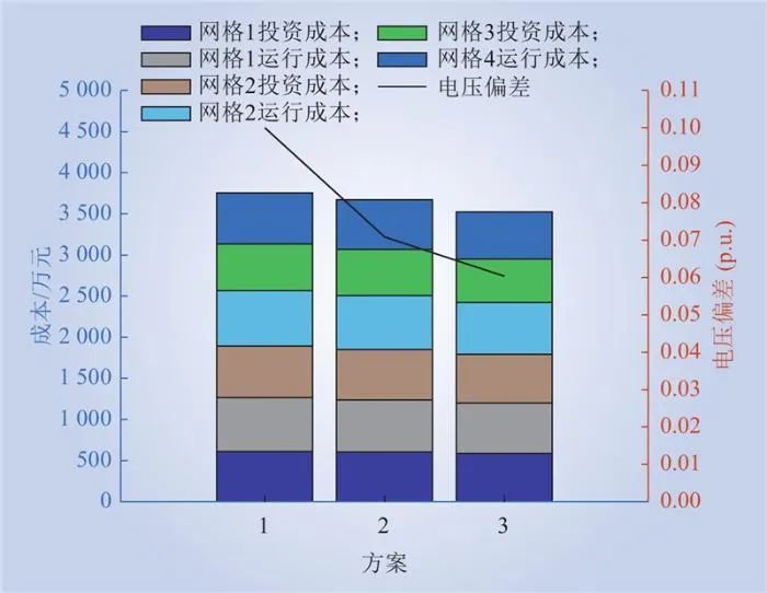 為了校驗(yàn)本文所提規(guī)劃模型的優(yōu)勢(shì),設(shè)置以下3種方案進(jìn)行分析對(duì)比:方案1為根據(jù)《指導(dǎo)原則》確定的規(guī)劃方案;方案2為采用集中式的資源布局,沒(méi)有考慮分布式資源的地理位置和分布特性;方案3為本文所提的3層規(guī)劃模型。比較結(jié)果如圖10所示,相比方案1、方案2,方案3的成本和電壓偏差都有所降低,說(shuō)明該規(guī)劃經(jīng)濟(jì)性和可靠性都得到了優(yōu)化。這是因?yàn)閭鹘y(tǒng)方法未充分考慮各區(qū)域分布式資源的稟賦,導(dǎo)致棄風(fēng)棄光現(xiàn)象嚴(yán)重;而方案3改善了分布式資源在時(shí)間與空間維度上的不平衡,并充分利用電價(jià)差實(shí)現(xiàn)最優(yōu)調(diào)度,提升了規(guī)劃方案的經(jīng)濟(jì)性和可靠性。