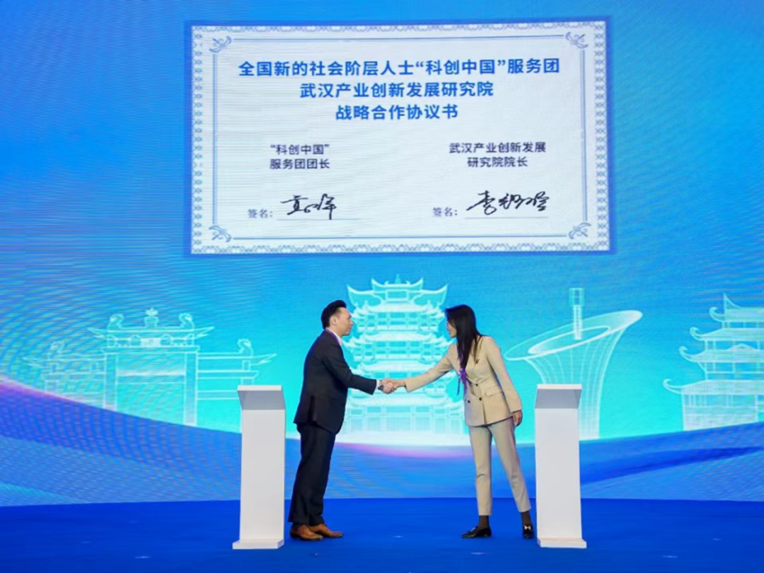 ▲ 啟動儀式上,葛群代表新的社會階層人士“科創(chuàng)中國”服務(wù)團(tuán)與武漢產(chǎn)業(yè)創(chuàng)新發(fā)展研究院簽署戰(zhàn)略合作協(xié)議