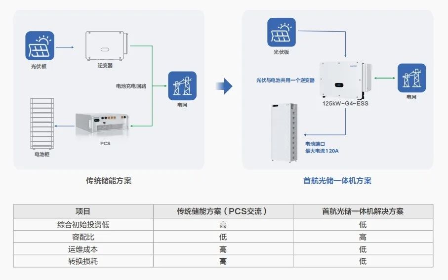首航光儲(chǔ)一體機(jī)為?直流耦合儲(chǔ)能方案?,通過(guò)光伏組件直接接入儲(chǔ)能系統(tǒng),減少傳統(tǒng)交流耦合方案中的3次電能轉(zhuǎn)換環(huán)節(jié)中所帶來(lái)的電能損耗。系統(tǒng)效率提升5~10%以上,度電成本降低超10~15%。適用于自發(fā)自用(單多機(jī)防逆流、全額上網(wǎng)、并離網(wǎng)場(chǎng)景)。