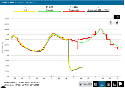 西班牙國家電網(wǎng)公司Red Eléctrica官網(wǎng)的運(yùn)行數(shù)據(jù)顯示,當(dāng)天中午十二點(diǎn)半左右,西班牙電網(wǎng)負(fù)荷從大約2500萬千瓦驟降至約1400萬千瓦,隨后一小時(shí)內(nèi)進(jìn)一步下降至約1000萬千瓦,截至發(fā)稿,負(fù)荷緩慢恢復(fù)至約1200萬千瓦,仍有大量電力供應(yīng)沒有恢復(fù)。