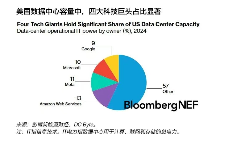 中國儲能網(wǎng)訊:目前,Amazon Web Services(AWS)、谷歌、Meta和微軟四家公司控制著美國近一半的數(shù)據(jù)中心容量,且在未來建設中占據(jù)主導地位,從而形成了一個具有獨特影響力的電力需求群體。這使它們對未來十年的能源基礎設施規(guī)劃和投資具有重大影響力。