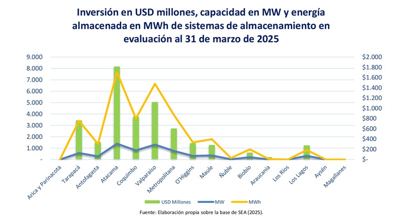 截至2025年3月31日,智利全國范圍內共37個儲能項目正在接受智利環(huán)境影響評估局(SEIA)的環(huán)境評估,總規(guī)模高達6.321GW/31.768GWh,計劃總投資65.77億美元(折合人民幣478.41億元),阿塔卡馬和瓦爾帕萊索地區(qū)規(guī)模最大,投資最高。