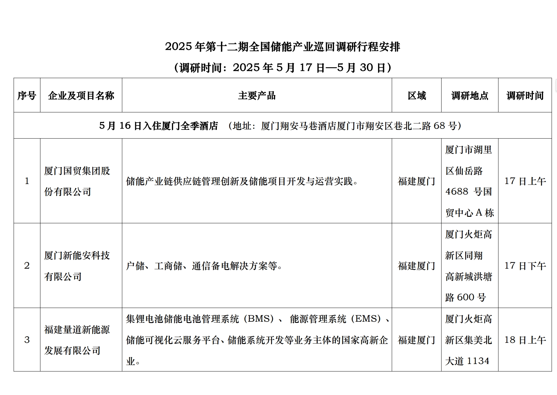 中國儲能網(wǎng)訊:為進一步做好“十五五”新型儲能產(chǎn)業(yè)發(fā)展規(guī)劃及了解當前儲能企業(yè)生產(chǎn)經(jīng)營現(xiàn)狀、生態(tài)鏈協(xié)同發(fā)展、行業(yè)內(nèi)卷、海外關稅及貿(mào)易壁壘、市場化商業(yè)模式、標準建設、政策機制等方面訴求,并向行業(yè)主管部門提出合理化建議。中國化學與物理電源行業(yè)協(xié)會儲能應用分會與中國儲能網(wǎng)決定將于5月17—29日組織開展2025年度第十二期全國儲能產(chǎn)業(yè)巡回調(diào)研工作,現(xiàn)將具體調(diào)研行程安排通知如下(最終行程以活動當天公布為準):