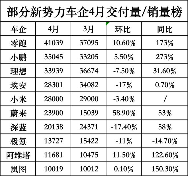 小米汽車來看,受此前事故影響,小米汽車在4月交付量出現(xiàn)下滑,交付超2.8萬輛,低于3月的超2.9萬輛。