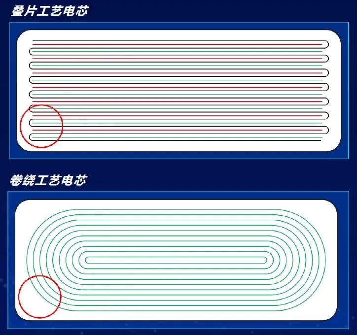 與眾多廠商不同的是,南都電源從20年前便選擇了鋰電疊片工藝,而不是常規(guī)的卷繞工藝,就是基于對電池安全性和循環(huán)壽命的考量。疊片工藝相較卷繞工藝實現(xiàn)了更高的能量密度,同時極片膨脹收縮時保持平整,內部應力分布均勻,不存在弧形拐角處的應力集中問題,使用更安全。