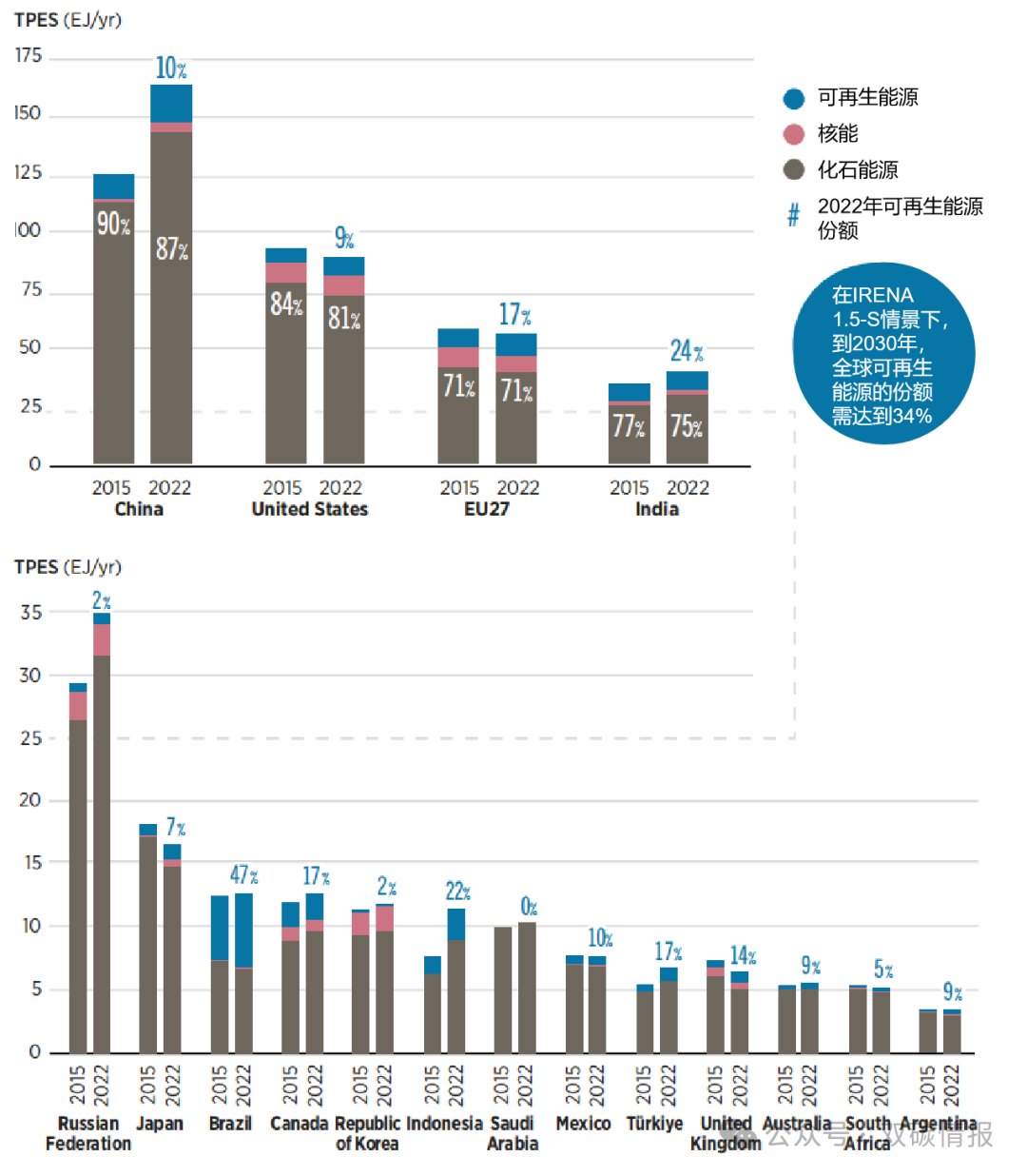 圖1 2015年和2022年G20國家按能源類型劃分的總一次能源供應[1]