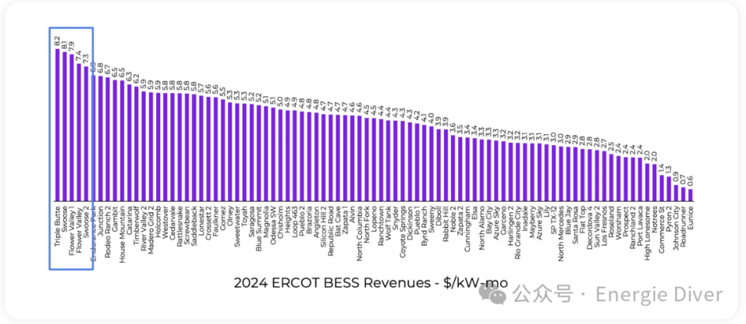 此基線存在一些局限性。儲能根據(jù)其當(dāng)前估計的能量容量分為1小時或2小時持續(xù)時間組。此外,基線未考慮輔助服務(wù)、日前市場或效率損失。然而,隨著實時能源套利在電池收入結(jié)構(gòu)中占比越來越大,我們認(rèn)為上下價差是最有意義的基準(zhǔn)。由于ERCOT中BESS能源收入的絕大多數(shù)來自實時能源市場,我們認(rèn)為這是最有意義的基準(zhǔn)。