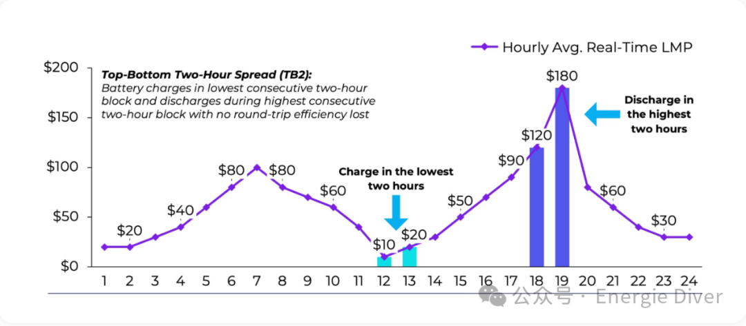 為此,我們按持續(xù)時間對電池分組,然后按持續(xù)時間計算實時上下價差。下圖展示了一個2小時儲能系統(tǒng)的概念,其中線上點表示小時平均實時(RT)價格,柱狀圖分別顯示在最高和最低小時價格期間充電成本和放電收入。