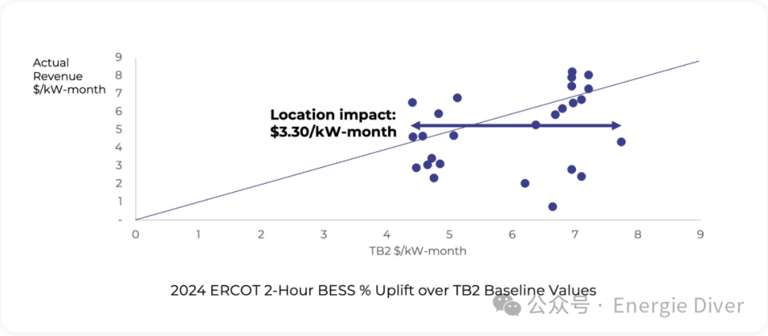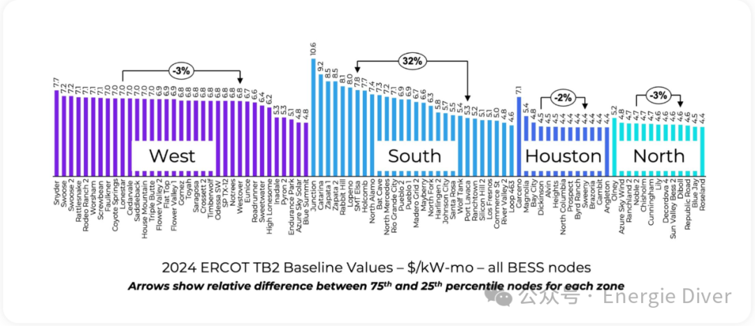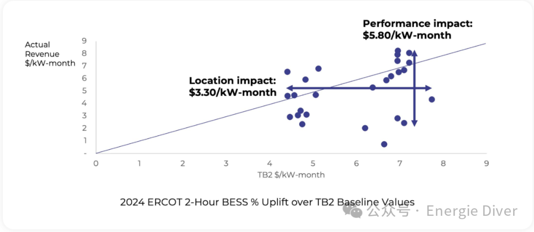 為了更好地將運(yùn)營商表現(xiàn)與位置的影響分開,我們使用上下(TB-Top and Bottom)收入價差作為基線來標(biāo)準(zhǔn)化BESS性能。