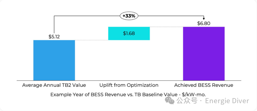 為了評估優(yōu)化,我們查看每個電池相較于TB基線的提升百分比,計算方法是將實際系統(tǒng)收入除以特定位置的TB2基線值。例如,如果一個電池的收入為6.80美元/千瓦-月,TB2基線為5.12美元/千瓦-月,則提升為33%。在許多情況下,該值為負(fù),因為電池收入低于位置基線。