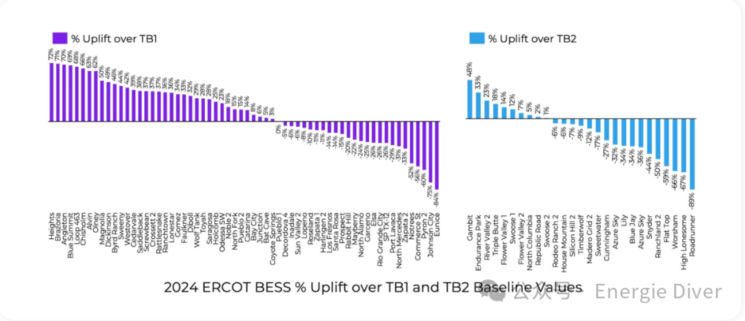 此圖比較了所有1小時和2小時電池的TB1和TB2提升。請注意,TB1往往顯示更多的正提升,因為1小時電池相較于TB1基線的輔助服務(wù)收入高于2小時電池相較于TB2基線的輔助服務(wù)收入。因此,1小時和2小時BESS在提升上不可直接比較。但在每個持續(xù)時間組內(nèi),性能差異很大。