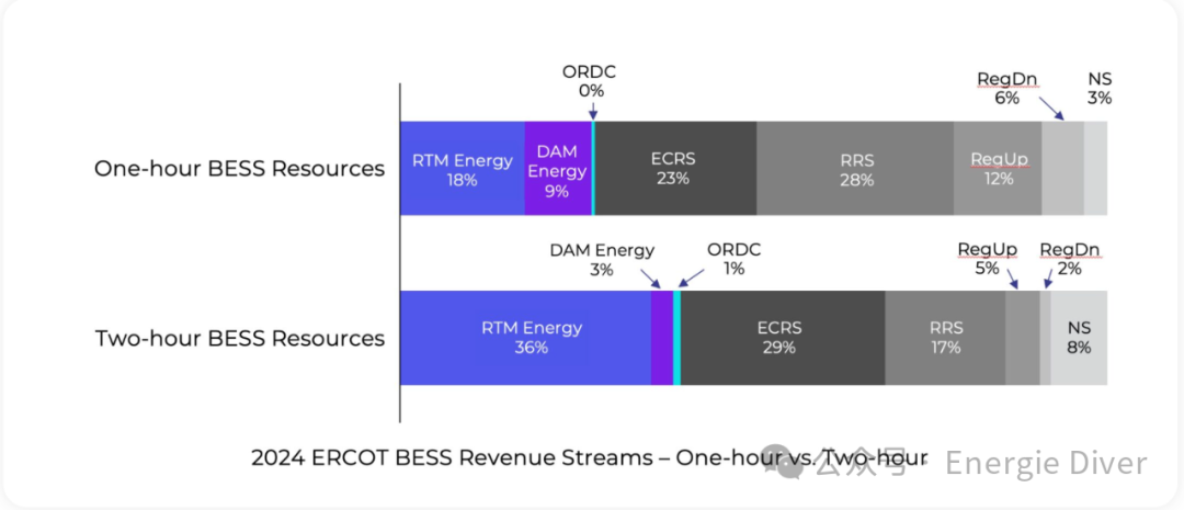 此圖顯示了1小時和2小時電池之間的策略差異。在1小時電池中,系統(tǒng)收入中不到30%來自能源套利,而在2小時電池中,超過40%的收入來自能源套利。