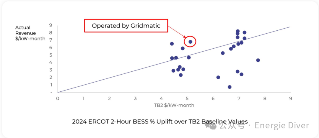 在我們的案例中,我們2024年全年運(yùn)營的一個電池在總收入中排名第六,但在TB2性能中排名第二。其性能代表相較于ERCOT中BESS加權(quán)平均收入的48%提升,展示了人工智能優(yōu)化在最大化電池儲能回報方面的影響,無論位置如何。