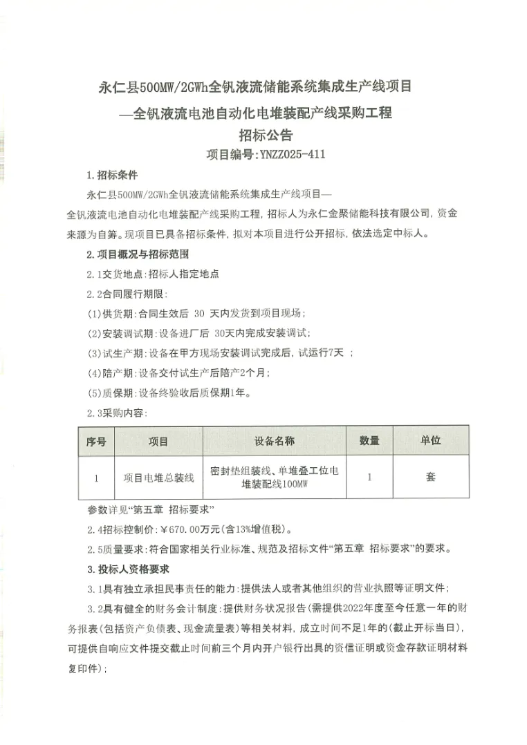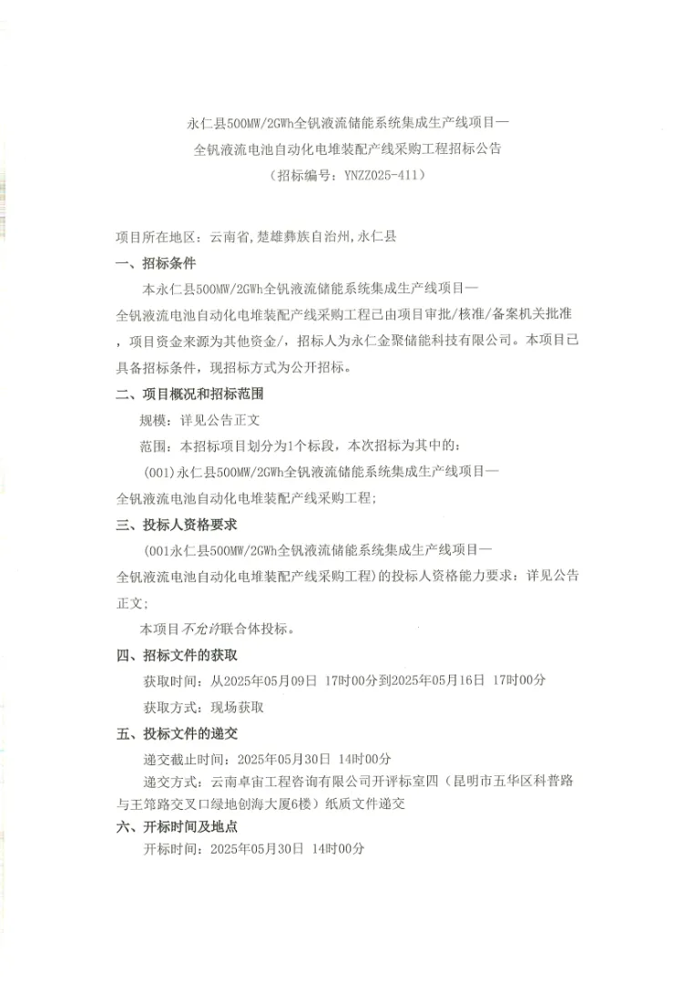 500MW/2GWh!云南永仁全釩液流電池自動(dòng)化電堆裝配產(chǎn)線采購工程招標(biāo)公告