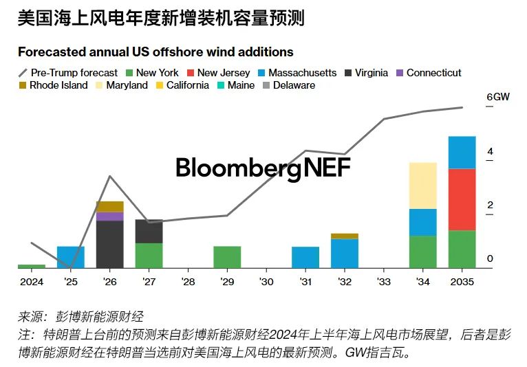 彭博新能源財經對美國到2035年海上風電裝機容量的預測較特朗普當選前下降56%。彭博新能源財經預計,5.7GW在建項目將繼續(xù)推進,但那些處于早期開發(fā)階段的項目面臨延遲甚至取消風險。