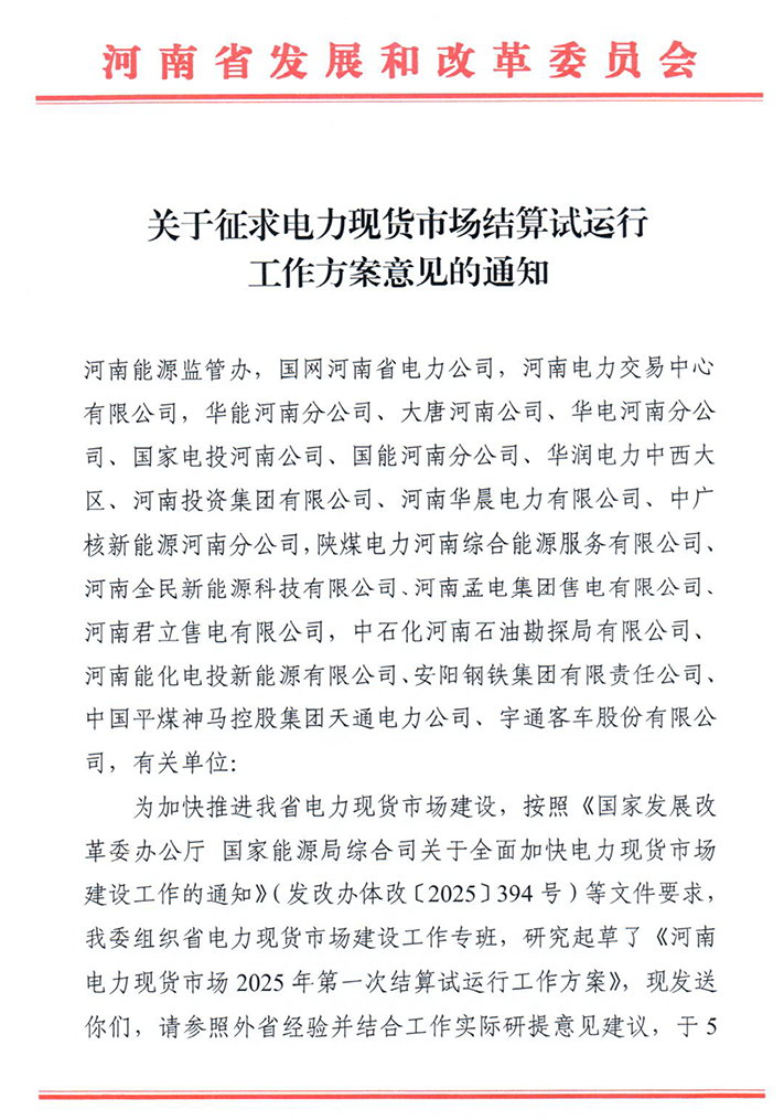 中國儲能網(wǎng)訊:近日,河南省發(fā)改委發(fā)表了《關(guān)于征求電力現(xiàn)貨市場結(jié)算試運(yùn)行工作方案意見的通知》,針對《河南電力現(xiàn)貨市場2025年第一次結(jié)算試運(yùn)行工作方案》征求意見(以下簡稱《工作方案》)。河南將于5月份適時開展現(xiàn)貨市場結(jié)算試運(yùn)行。