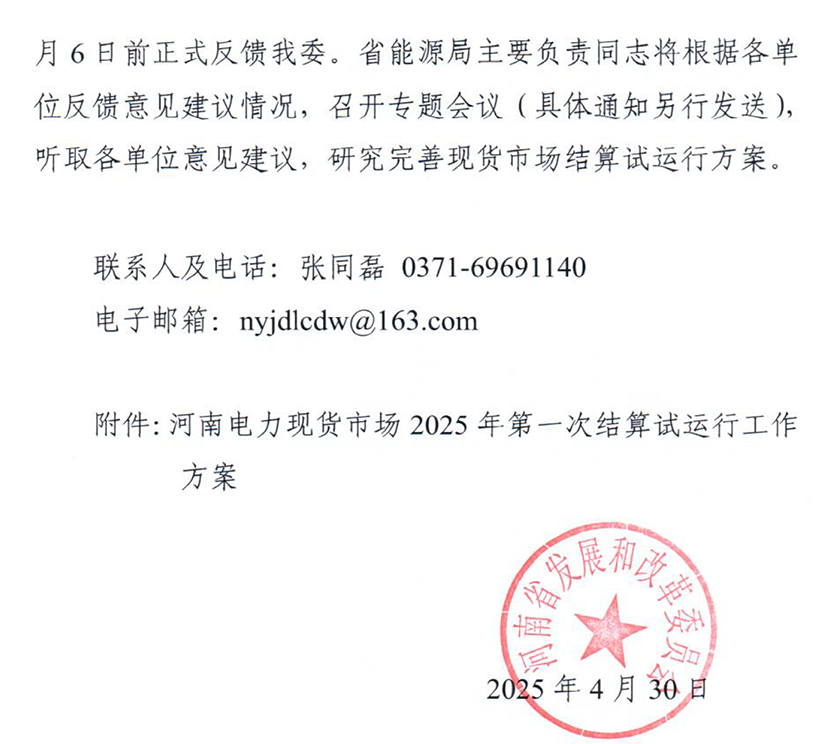 中國儲能網(wǎng)訊:近日,河南省發(fā)改委發(fā)表了《關(guān)于征求電力現(xiàn)貨市場結(jié)算試運行工作方案意見的通知》,針對《河南電力現(xiàn)貨市場2025年第一次結(jié)算試運行工作方案》征求意見(以下簡稱《工作方案》)。河南將于5月份適時開展現(xiàn)貨市場結(jié)算試運行。