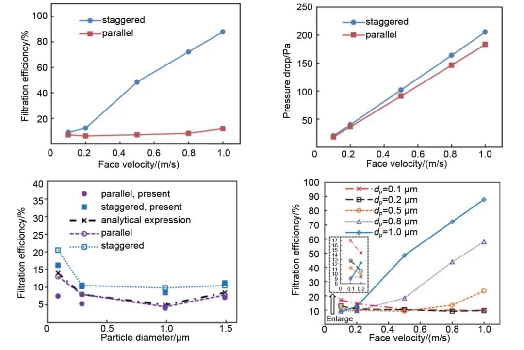Li等研究了不同纖維排列、纖維直徑、面流速和粒徑下的壓降和過(guò)濾效率。研究發(fā)現(xiàn):對(duì)于不同粒徑過(guò)濾效率隨表面速度的增大而增大(如圖4所示)。此外,對(duì)比相同纖維直徑和總固體濃度(SVF)的層狀結(jié)構(gòu),發(fā)現(xiàn)在所有模擬顆粒尺寸下,密集-稀疏結(jié)構(gòu)在高壓降的情況下具有最高的過(guò)濾效率。