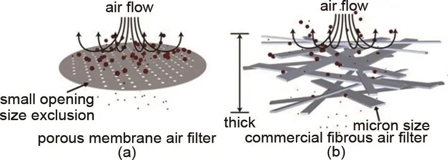 研究者發(fā)現(xiàn)提高過(guò)濾效率往往會(huì)增加系統(tǒng)的阻力。多孔膜過(guò)濾器[如圖5(a)所示]是通過(guò)在固體基材上的孔隙制成的,它的孔徑非常小,孔隙率低于0.3。因此它的過(guò)濾效率很高,但是它的局限性在于壓降很大。相比之下,纖維狀空氣過(guò)濾器,它通過(guò)厚物理屏障和黏附力來(lái)捕獲顆粒物顆粒[如圖5(b)所示]。它的孔隙率高于0.7,由直徑從幾微米到幾十微米不等的多層厚纖維制成。為了獲得高效率,這種類(lèi)型的過(guò)濾器通常很厚。