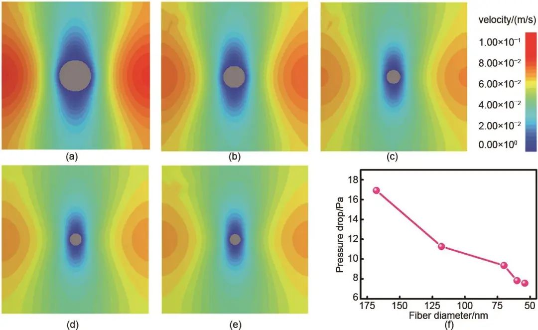 圖 6 單根纖維在5.3 cm/s處的模擬壓降:(a) 168,(b) 108,(c) 71,(d) 60 和 (e) 53 nmFig. 6 Simulated pressure drop of a single fiber at 5.3 cm/s: (a) 168, (b) 108, (c) 71, (d) 60, and (e) 53 nm