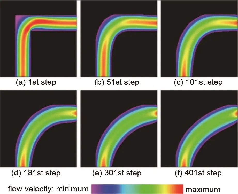 Wang等提出了一種啟發(fā)式最優(yōu)性準(zhǔn)則算法,以?xún)?yōu)化低Re數(shù)流體流經(jīng)直角彎頭和會(huì)聚T形結(jié)的通道形狀設(shè)計(jì)(圖14)。啟發(fā)式算法避免了敏感性分析,更重要的是給出了合理的流道最優(yōu)設(shè)計(jì)。