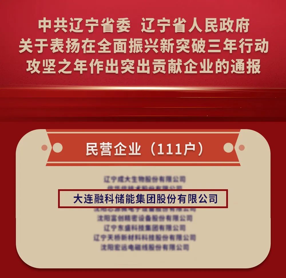 此次大會(huì),規(guī)格之高、規(guī)模之大,盡顯遼寧省推動(dòng)企業(yè)高質(zhì)量發(fā)展的堅(jiān)定決心。遼寧省委書記、省人大常委會(huì)主任郝鵬親臨現(xiàn)場(chǎng)并發(fā)表重要講話,遼寧省委副書記、省長(zhǎng)王新偉主持會(huì)議,各界目光聚焦于此。大會(huì)現(xiàn)場(chǎng),省委常委、組織部部長(zhǎng)蔣天寶宣讀了省委、省政府《關(guān)于表?yè)P(yáng)在全面振興新突破三年行動(dòng)攻堅(jiān)之年作出突出貢獻(xiàn)企業(yè)的通報(bào)》,融科儲(chǔ)能在一眾國(guó)企、民企、外企和金融機(jī)構(gòu)中脫穎而出,與其他 240家優(yōu)秀企業(yè)一同受到通報(bào)表?yè)P(yáng)。