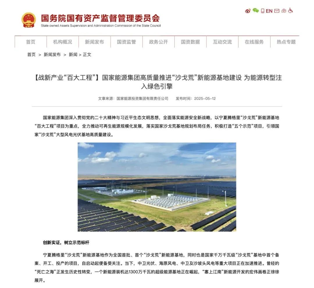 中國儲能網(wǎng)訊:在“雙碳”目標(biāo)指引下,國家能源集團(tuán)積極踐行使命,全力推動可再生能源規(guī)模化發(fā)展,其中寧夏騰格里“沙戈荒”新能源基地作為全國首批、首個“沙戈荒”新能源基地,同時也是國家千萬千瓦級“沙戈荒”基地中首個備案、開工、投產(chǎn)的項目,自啟動起便備受關(guān)注。5月12日,《國家能源集團(tuán)高質(zhì)量推進(jìn)“沙戈荒”新能源基地建設(shè) 為能源轉(zhuǎn)型注入綠色引擎》在國務(wù)院國資委網(wǎng)站【戰(zhàn)新產(chǎn)業(yè)“百大工程”】系列專題發(fā)布。