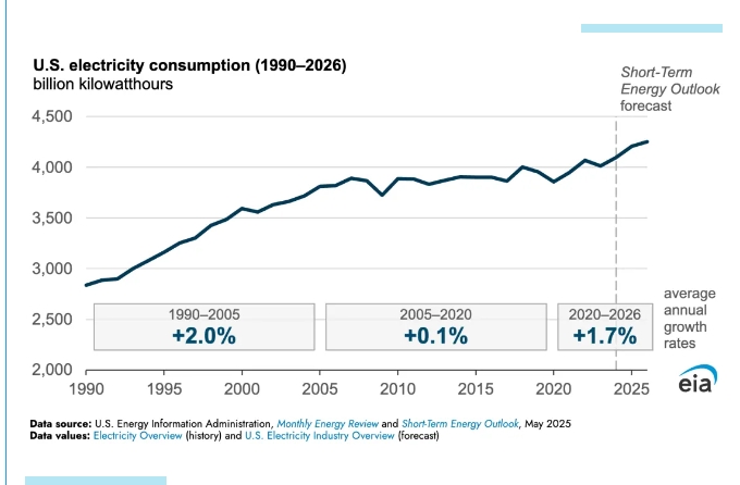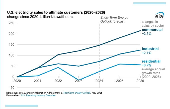 中國(guó)儲(chǔ)能網(wǎng)訊:根據(jù)美國(guó)能源信息署(EIA)預(yù)測(cè),美國(guó)的年度電力消費(fèi)將在2025年和2026年增加,并超過(guò)2024年創(chuàng)下的歷史新高。這一增長(zhǎng)與2000年代中期到2020年代初相對(duì)平穩(wěn)的電力需求趨勢(shì)形成對(duì)比。最近和預(yù)測(cè)中的電力消費(fèi)增長(zhǎng)主要來(lái)自商業(yè)部門(mén)(包括數(shù)據(jù)中心)和工業(yè)部門(mén)(包括制造企業(yè))。