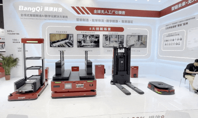 展會現場,磅旗科技同步展示移動機器人系列矩陣,涵蓋潛伏式機器人、移/重載機器人、叉取機器人、料箱機器人等,集智能導航、柔性調度、高性價比于一體,適配多類電池制造流程中的高頻高精需求,成為本屆展會備受矚目的明星產品陣容。