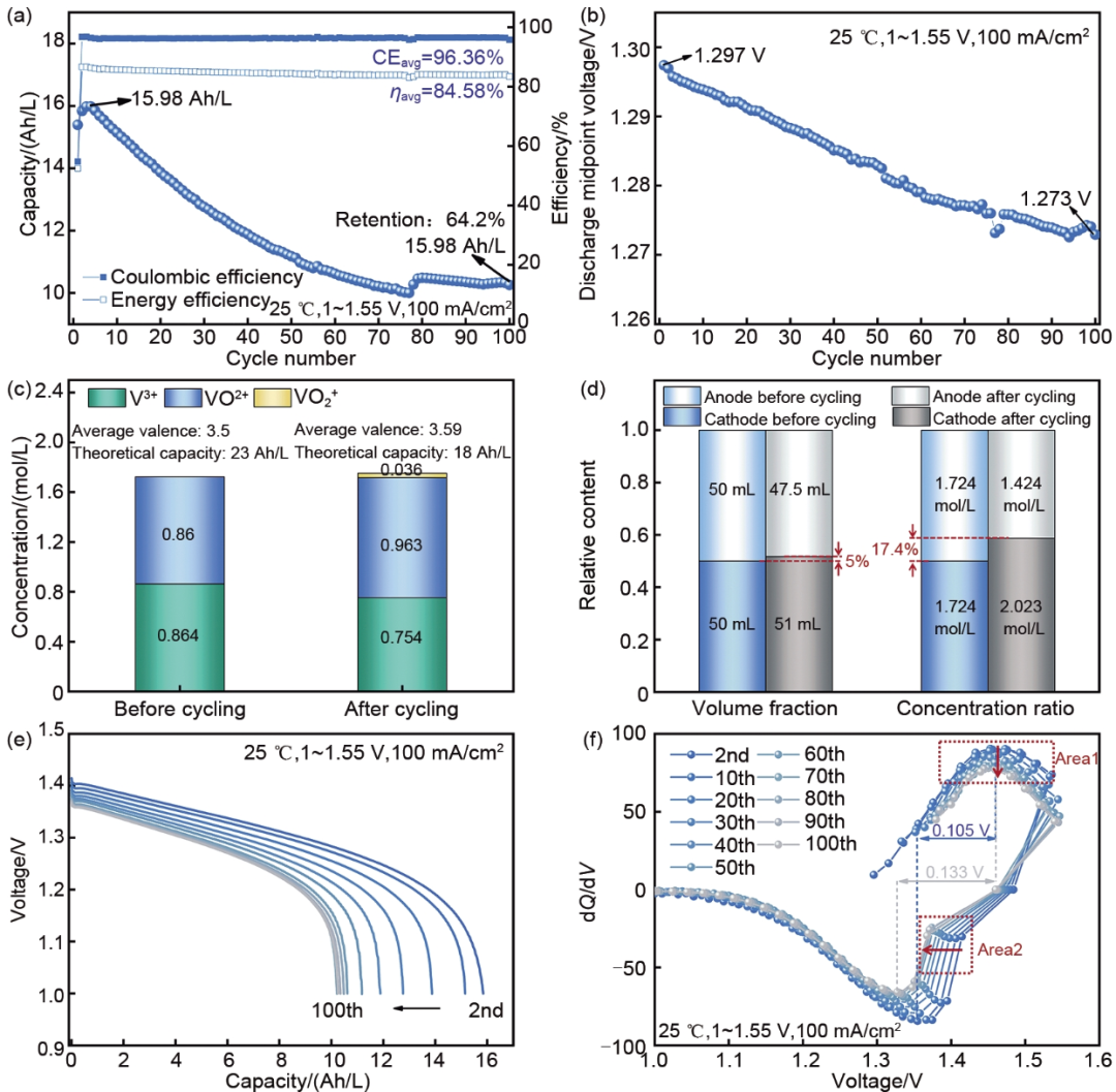 圖1 (a) 原廠電解液循環(huán)100圈的放電比容量、庫(kù)侖效率CE和能量效率η;(b) 放電中值電壓曲線(xiàn);(c) 循環(huán)前后電解液的組成對(duì)比;(d) 循環(huán)前后正負(fù)極電解液體積和濃度對(duì)比;(e) 第2圈及每10圈的放電曲線(xiàn);(f) 微分電容曲線(xiàn)