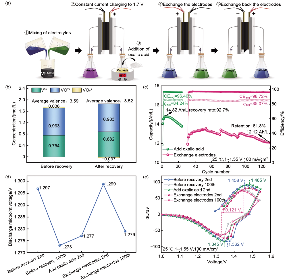在本工作中,首先采用電化學(xué)滴定的方法,研究了電解液在長(zhǎng)循環(huán)后的體積、濃度及價(jià)態(tài)變化,發(fā)現(xiàn)負(fù)極電解液的濃度偏差是導(dǎo)致容量衰減的主要原因。并且通過(guò)分析微分電容曲線(xiàn)(dQ/dV),發(fā)現(xiàn)電池容量衰減是由活性物質(zhì)含量降低和極化加劇共同引起。另外,通過(guò)對(duì)比草酸恢復(fù)和交換電極恢復(fù)后的電化學(xué)曲線(xiàn),驗(yàn)證了電極活性降低會(huì)導(dǎo)致極化加劇,并發(fā)現(xiàn)交換電極可部分恢復(fù)電極活性從而緩解容量衰減。最后,通過(guò)恒流恒壓充電解決了草酸殘留問(wèn)題,制定了草酸恢復(fù)電解液的工藝流程。