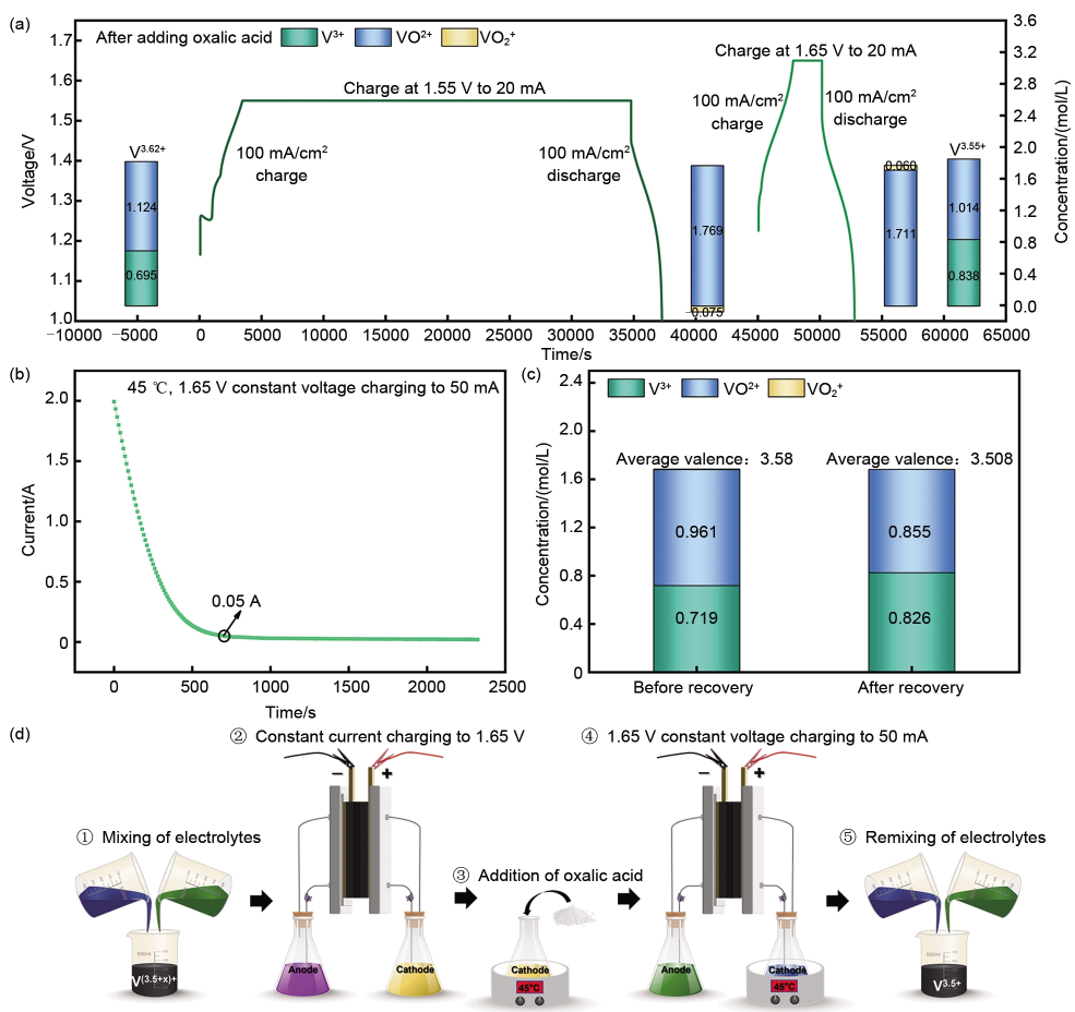 圖3 (a) 恒流恒壓輔助下草酸恢復(fù)時(shí)的充放電曲線(xiàn)及電解液組成對(duì)比;(b) 1.65 V恒壓充電時(shí)電流隨時(shí)間的變化;(c) 恢復(fù)前后電解液的組成對(duì)比;(d) 草酸恢復(fù)工藝流程