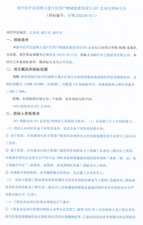中國(guó)儲(chǔ)能網(wǎng)訊:5月16日,揚(yáng)中市正揚(yáng)建設(shè)有限公司發(fā)布了揚(yáng)中經(jīng)開區(qū)園博大道片區(qū)用戶側(cè)儲(chǔ)能建設(shè)項(xiàng)目EPC總承包招標(biāo)公告,項(xiàng)目位于江蘇省鎮(zhèn)江市揚(yáng)中市,擬利用揚(yáng)中經(jīng)開區(qū)園博大道片區(qū)部分企業(yè)的閑置場(chǎng)地或綠化帶建設(shè)儲(chǔ)能電站,總裝機(jī)規(guī)模為 129MW/387MWh(交流側(cè)),共配置 129 套儲(chǔ)能單元,每套儲(chǔ)能單元裝機(jī)容量為1MW/3MWh。
